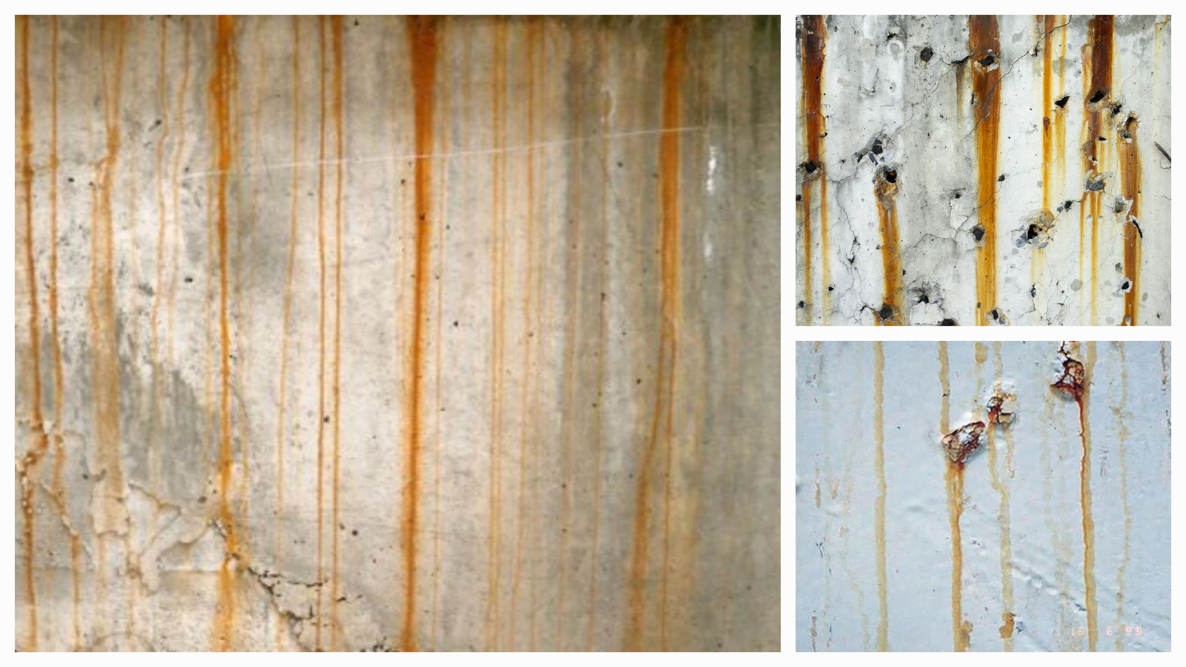 • Water running off a rusty metal surface onto a painted area below.